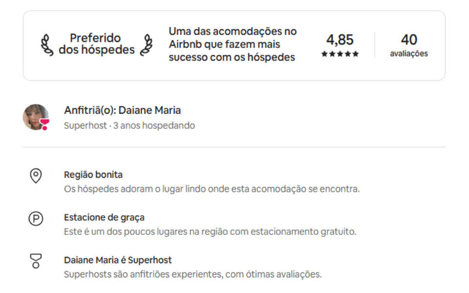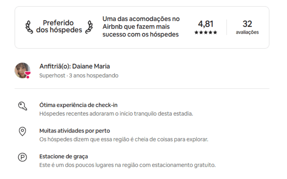 Reconhecida pela hospitalidade, atenção no check-in e suporte durante toda a estadia, garantindo uma experiência tranquila e segura aos hóspedes.